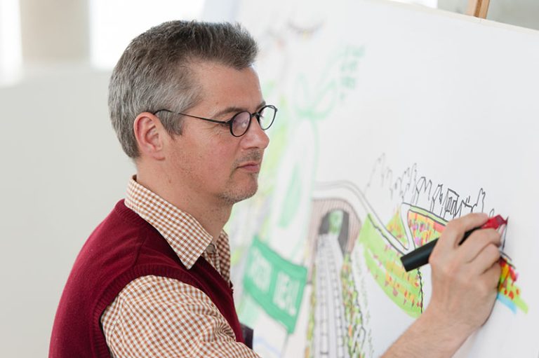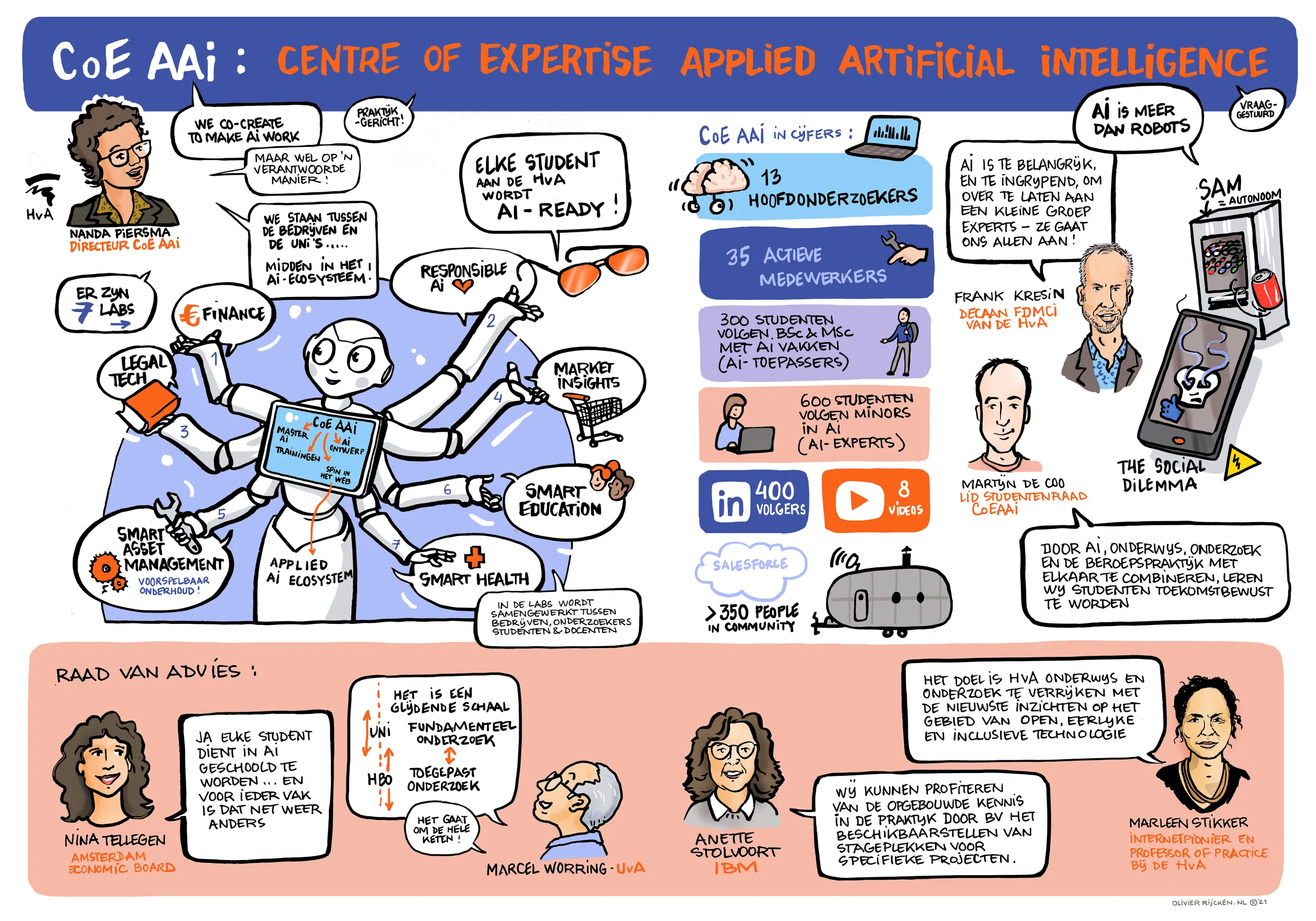 Olivier Rijcken maakte een infographic voor het magazine waarin onze doelen, visie, labs en ambities verbeeld werden. De tekening is mooi ijkpunt voor de ontwikkeling van het Centre of Expertise Applied AI. Zo laat het onderdeel ‘CoE AAI in cijfers’ goed zien waar we stonden in 2021.